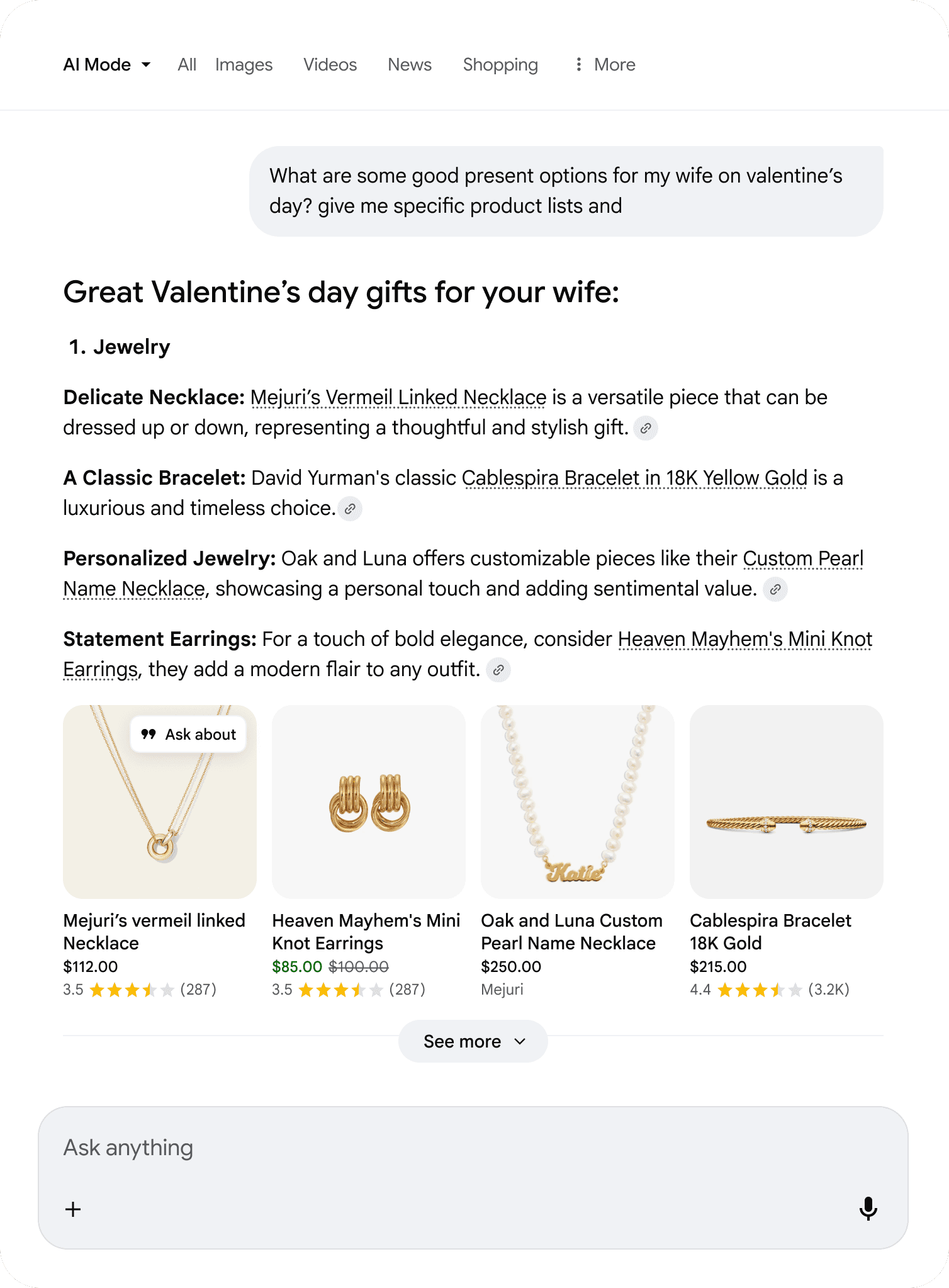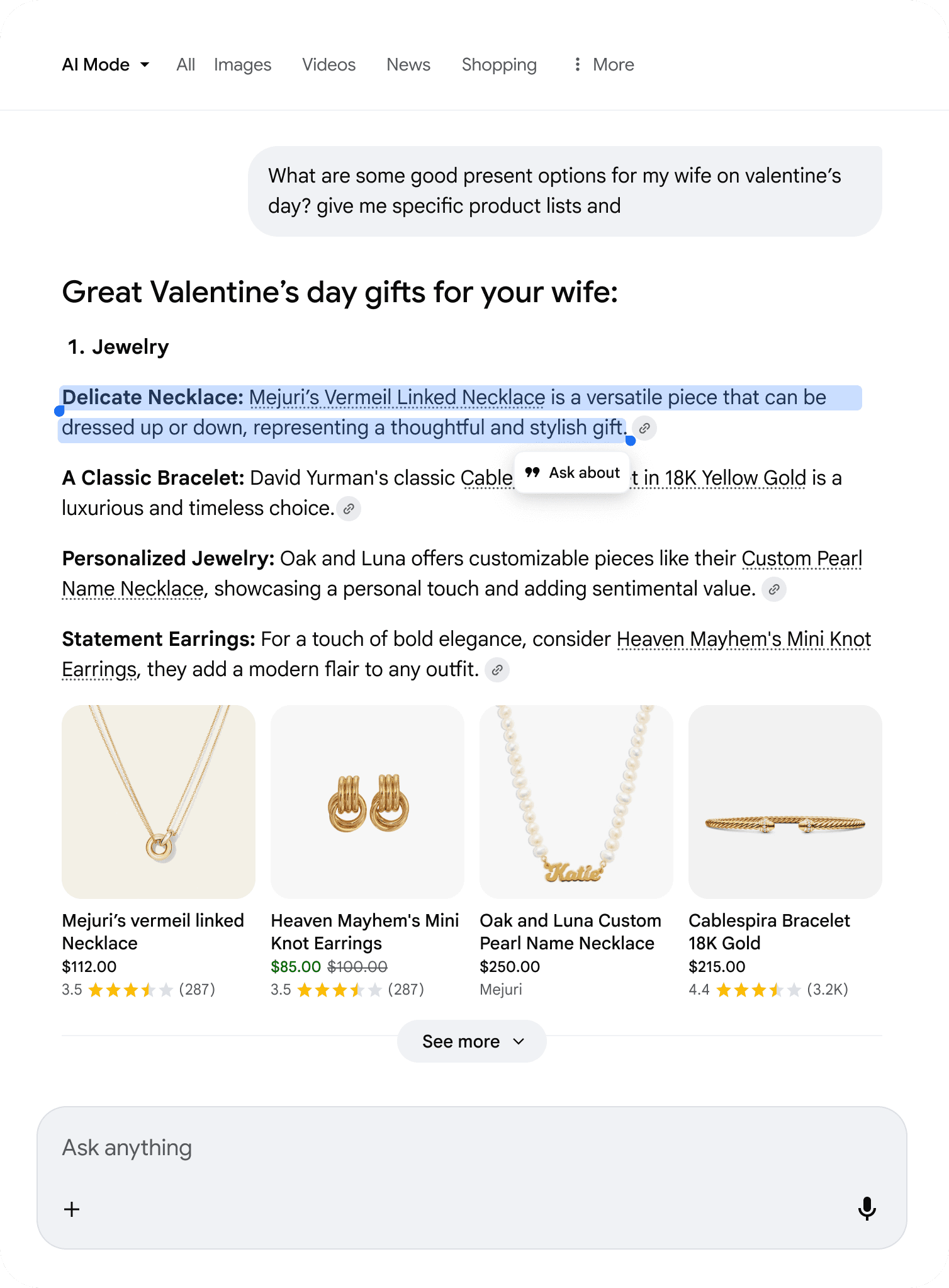 Contextual ways to follow-up on content within an AI Mode response.