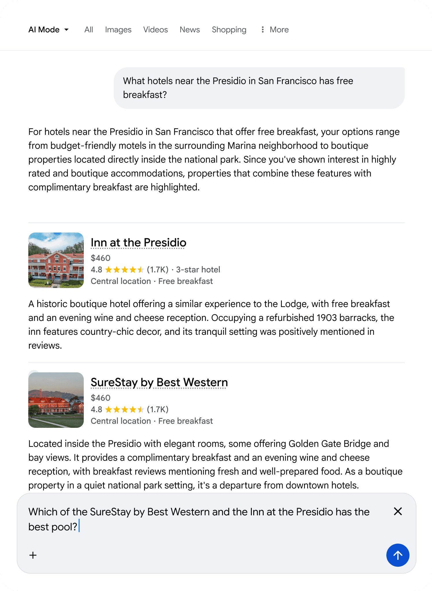 In early user observation of AIM, we noticed a pattern of frustration. AI Mode would provide a great response listing different entities for a search like "What hotels near the Presidio in SF has free breakfast? The user would read it, nod, and then… stop.